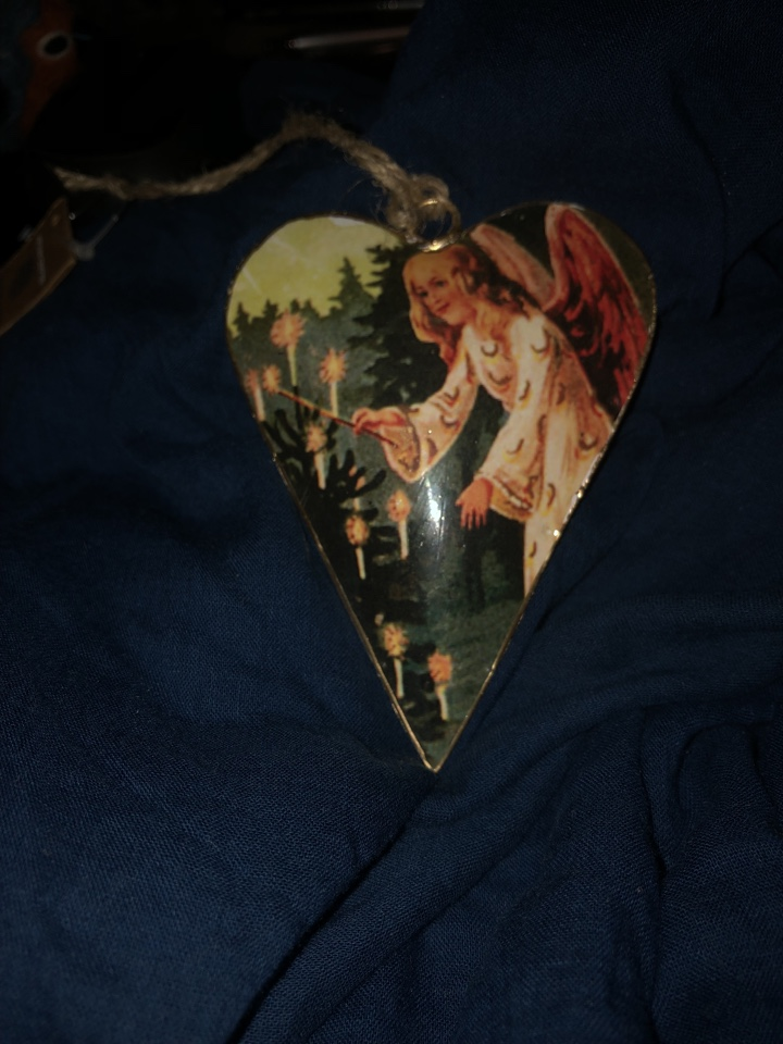 Herzförmige Vintage-Weihnachtsdekorationen aus Blech mit Engelmotiven. 10 x 7,5 cm.