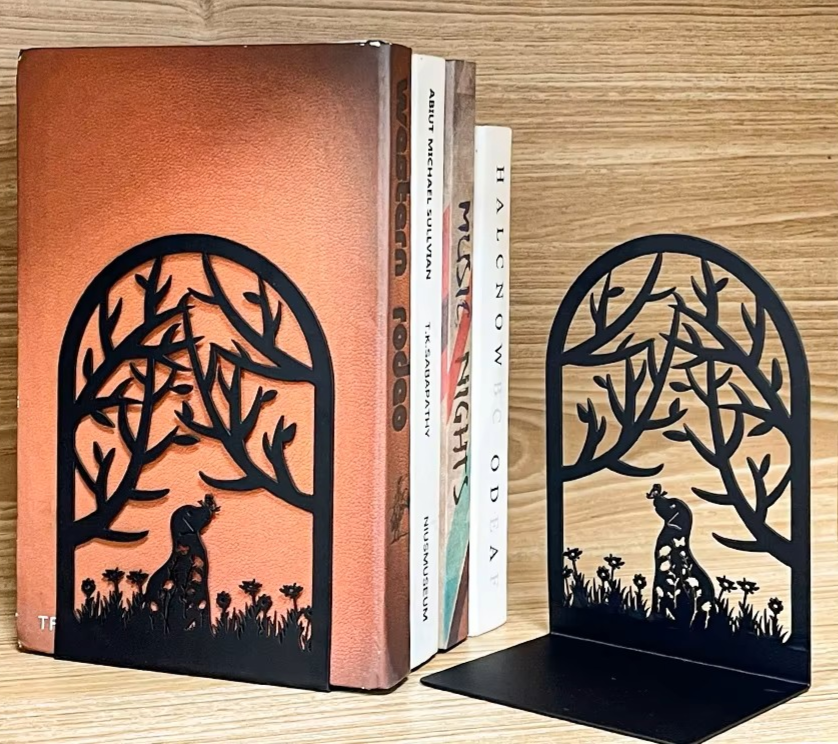 niedliche Buchstützen aus Metall im Scherenschnitt-Stil, Hund mit Schmetterling auf Nase
