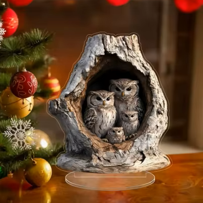 Wunderschönes flaches 2D-Acrybild einer Eulenfamilie im Holzstamm, mit Basis, zum Aufstellen auf Schreibtisch oder Fensterbank etc., 20 x 20 cm