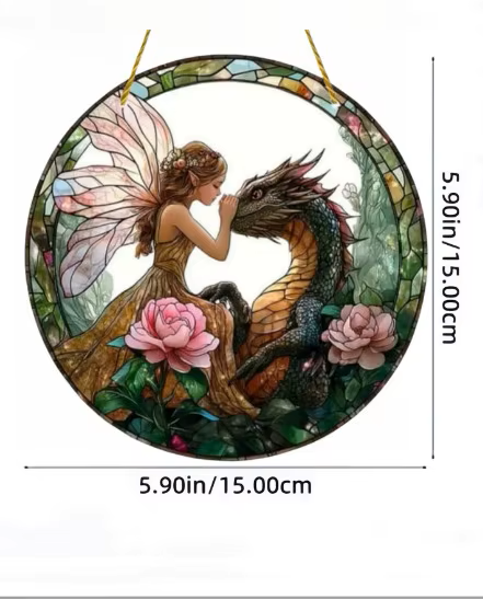 zauberhafte runde Fenster-Hängedeko mit Aufhängung, Acrylglas, 15 x 15 cm, für Fenster oder mitten im Raum vor einem einfarbigen Hintergrund, Elfe mit ihrem Drachen