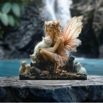 Sehr schöne Fee vor Wasserfall, mit weißer Katzenmama mit Babys , flaches 2D-Acrylschild, mit Basis zum Aufstellen auf Fensterbank, Tisch etc.