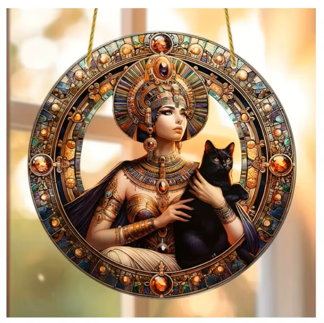 rundes mystisches Hänge-Fensterbild aus Acryl, 15 x 15 cm, altägyptische Göttin mit heiliger Katze, für das Fenster oder mitten im Raum vor einfarbigem Hintergrund, mit Aufhängung