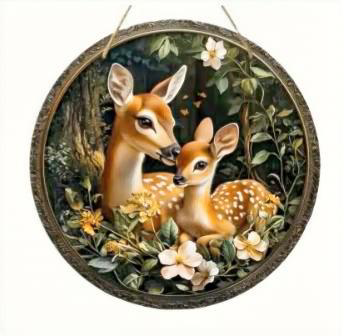 Süßes rundes Holzschild für Wand, mit 2D-Mondlichtmotiv Rehe Ricke mit Kitz, 20 x 20 cm, mit Aufhänger